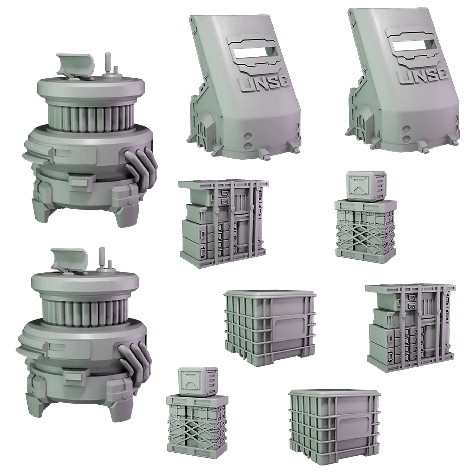 Enhance your games of Halo: Flashpoint by bringing your UNSC Firebase or Field Outpost arena to life with this set of highly-detailed scatter terrain, including UNSC Barriers, Generators, Crates and more.